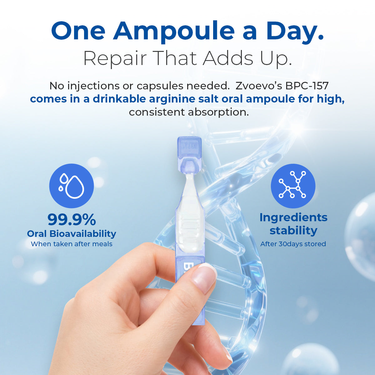 With 99.9% bioavailability when taken with food (pH 4.0), Zvoevo® BPC-157 offers unparalleled absorption. The Arginine Salt form ensures maximum stability and effectiveness, allowing your body to use every dose efficiently. Unlike other peptides that lose potency in the digestive process, our oral formula delivers results where you need them most.