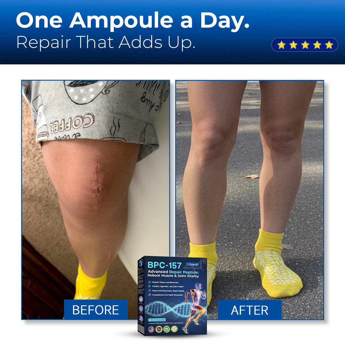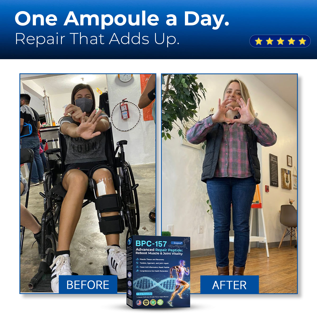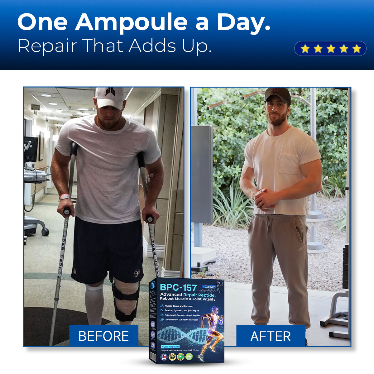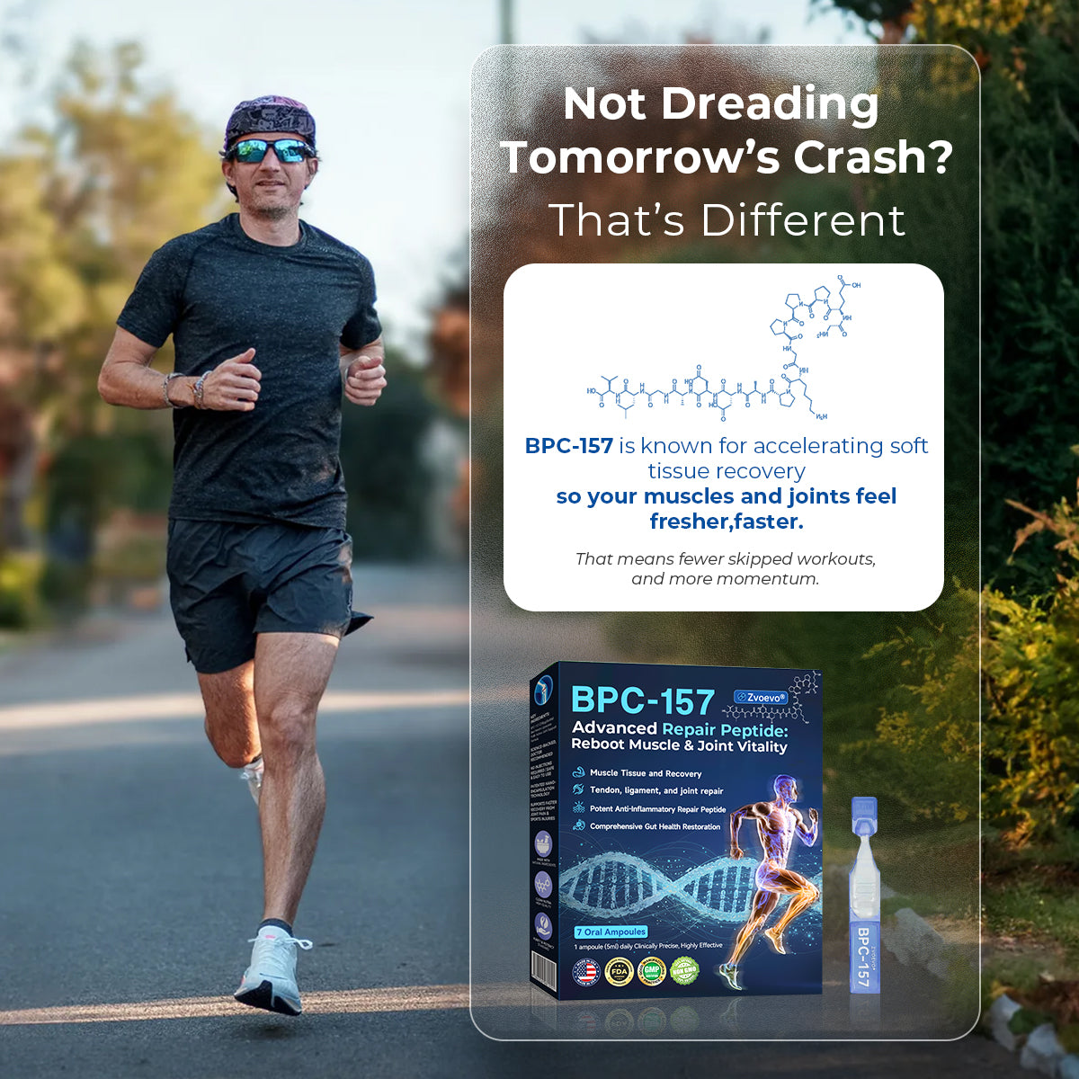 "I tore my calf tendon and was told I’d be on crutches for 12 weeks. I wanted the benefits of BPC-157 but was terrified of needles, so I tried Zvoevo’s oral version. The results were shocking. By day 10, the deep pain faded. At my 4-week checkup, my surgeon was stunned by the ultrasound—I had healed twice as fast as expected. I’m off crutches in just 6 weeks. If you hate needles, you need this!"