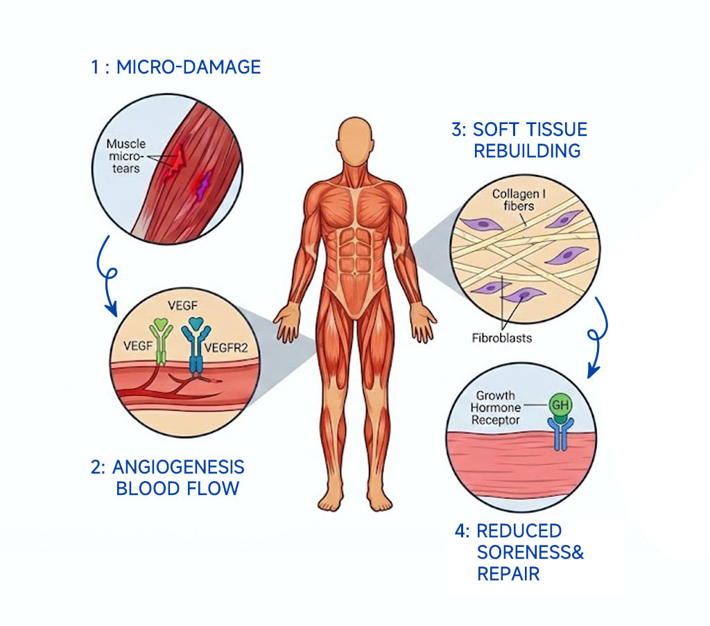 01. Beyond Just Joints: It triggers angiogenesis (new blood vessel formation) to rapidly rebuild torn muscles, strained tendons, damaged gut linings, and worn cartilage.